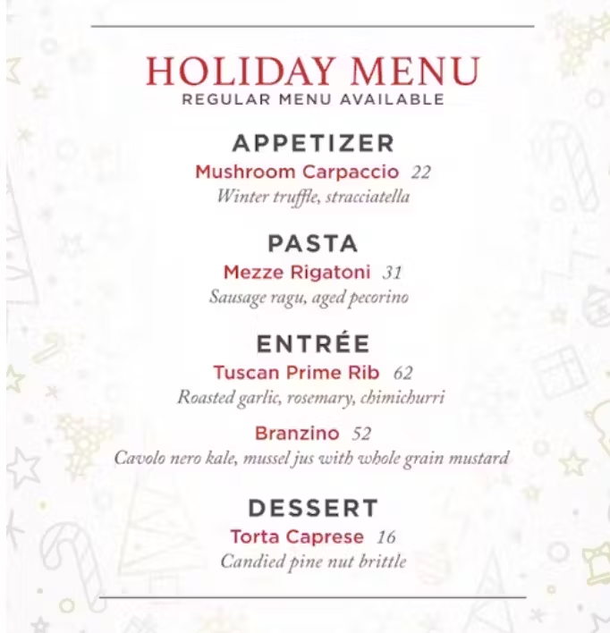 Spend your Christmas surrounded by friends, family, and the rustic elegance of Bottiglia. Our chefs have crafted an exclusive holiday menu featuring rich Italian-inspired dishes, luxurious winter ingredients, and festive flavors that capture the spirit of the season. The menu: